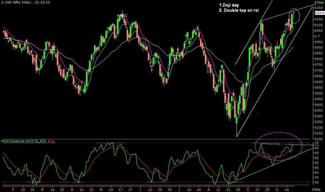 Yesterday's candle can also be taken as an evening star, a bearish sign. And as expected, nifty opened gap down and may close -ve too. But, nifty may be tiring out in immediate term and mid/small caps may stage a rally for a few days. Having said this, overall uptrend is still intact as long is 5980 is respected and 6280 is taken out latest by next week. Good luck Ajit for your website. :)
